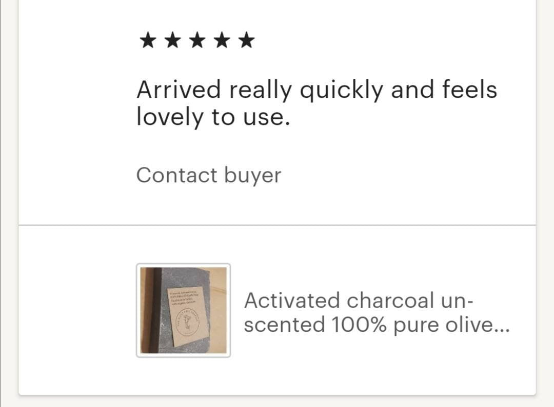 One bar of at least 100g, handmade, organic and vegan cold processed, traditionally made, castile soap with activated charcoal. Palm oil free and ingredients sustainably sourced.