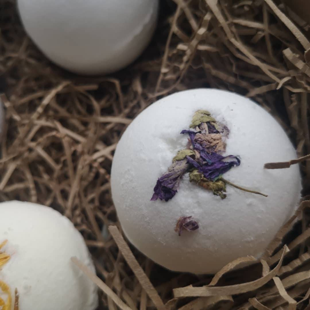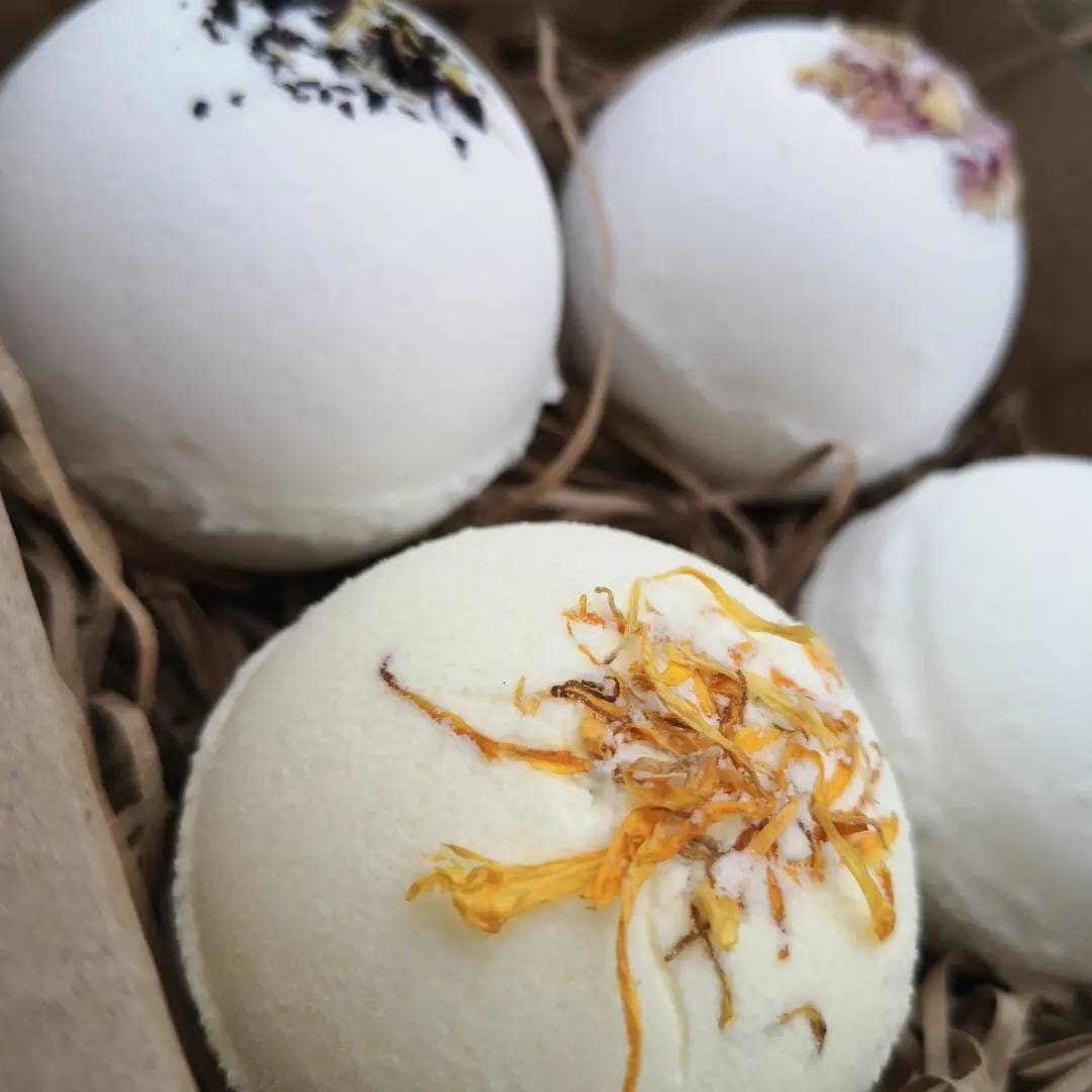 All packaging minimal, reused, recycled and home compostable. Each item inside is safely wrapped in eco kraft soy wax paper and held together with twine to make a low (environmental) impact but luxurious gift. Comes in a sealed box , gift ready. Ingredients and safety information can be found on the Kraft card attached to each bomb.