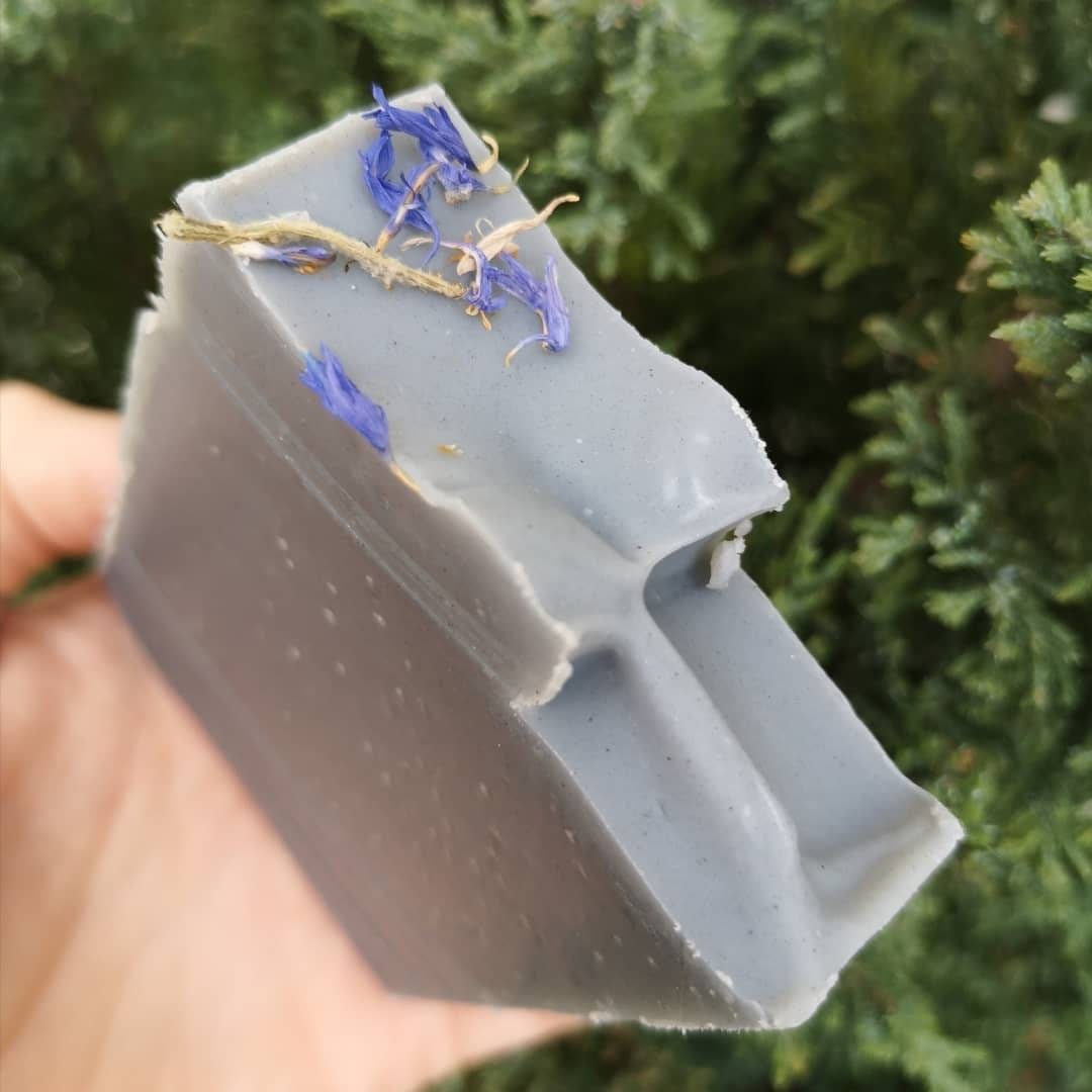 Activated charcoal added for its deep cleaning properties. Blue cornflower for decoration.